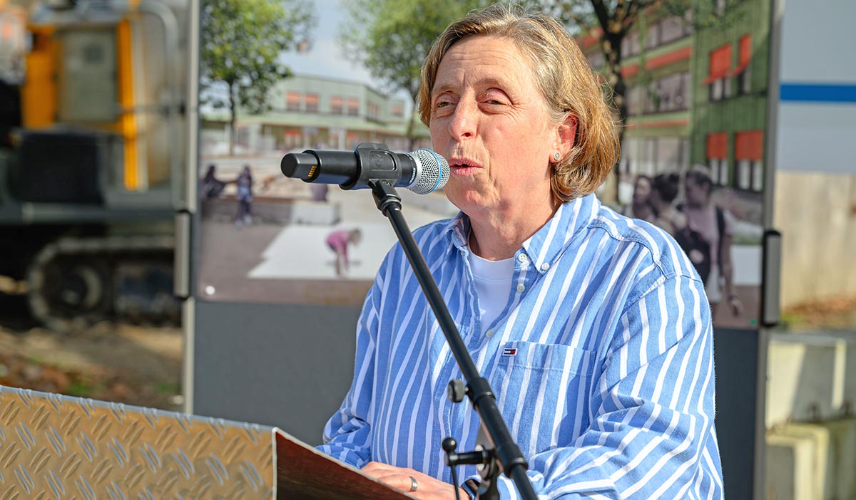 "Der heutige Spatenstich ist für uns ein ganz besonderer Moment. Mit dem Baubeginn nimmt unsere Vision einer modernen, offenen und vielfältigen Gesamtschule endlich sichtbare Formen an. Unter dem Motto „gemeinsam – zukunftsorientiert – in Bewegung“ treten wir als innovative Gesamtschule an für gemeinsames Lernen, Chancengerechtigkeit und für gelebte Vielfalt. Hier entsteht ein Ort, an dem alle uns anvertrauten jungen Menschen unabhängig von Herkunft oder Bildungsweg in der Entfaltung ihrer individuellen Talente optimal gefördert und zur gesellschaftlichen Teilhabe ermutigt werden. Damit leisten wir zugleich einen unverzichtbaren Beitrag zur Stabilität und Weiterentwicklung der innovativen und demokratischen Kultur in Oberhausen. Daher ist der heutige Tag ein starkes Signal für unsere gesamte Stadtgesellschaft", freut sich Frau Dr. Krüger-Hufmann, Schulleiterin der Gesamtschule an der Knappenstraße.