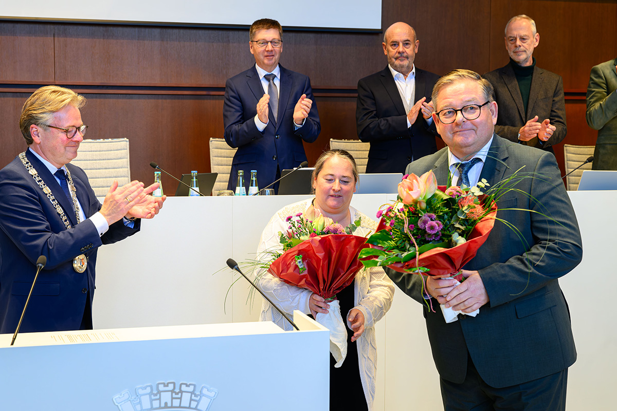 In der ersten Sitzung des neuen Stadtrates wurden neben der Vereidigung des Oberbürgermeisters auch seine Stellvertreter gewählt. Sonja Bongers (SPD) wurde zur ersten Bürgermeisterin gewählt und Werner Nakot (CDU) vom Rat als zweiter Bürgermeister bestätigt.