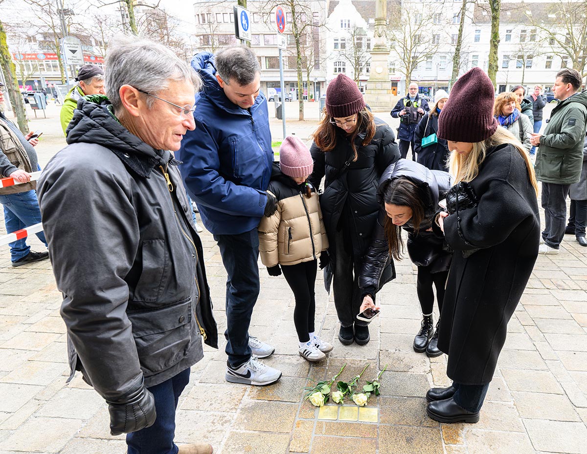 11.02.2026 - Am Dienstag, 10. Februar 2026, fand die diesjährige Verlegung von Stolpersteinen in Oberhausen statt. 29 neue Stolpersteine zeigen nun 29 unterschiedliche Schicksale von ehemaligen Oberhausener Bürgerinnen und Bürger, die allesamt Opfer des Nationalsozialismus wurden. Die Stolpersteine werden dabei immer in dem Gehweg vor dem letzten selbst gewählten Wohnort der Verfolgten eingelassen. Auf der Oberfläche jedes Steines sind der Name, das Geburtsjahr sowie die Schicksale der Menschen, an die erinnert werden soll, eingraviert. Bei den ersten Verlegungen war der Künstler Gunter Demnig persönlich vor Ort, begleitet von Bürgermeister Werner Nakot. Zu der Stolperstein-Verlegung in der Sachsenstraße waren der Enkel und die Urenkel von Chaim David Roth aus Israel angereist, für den Enkel war es der erste Besuch in Deutschland.