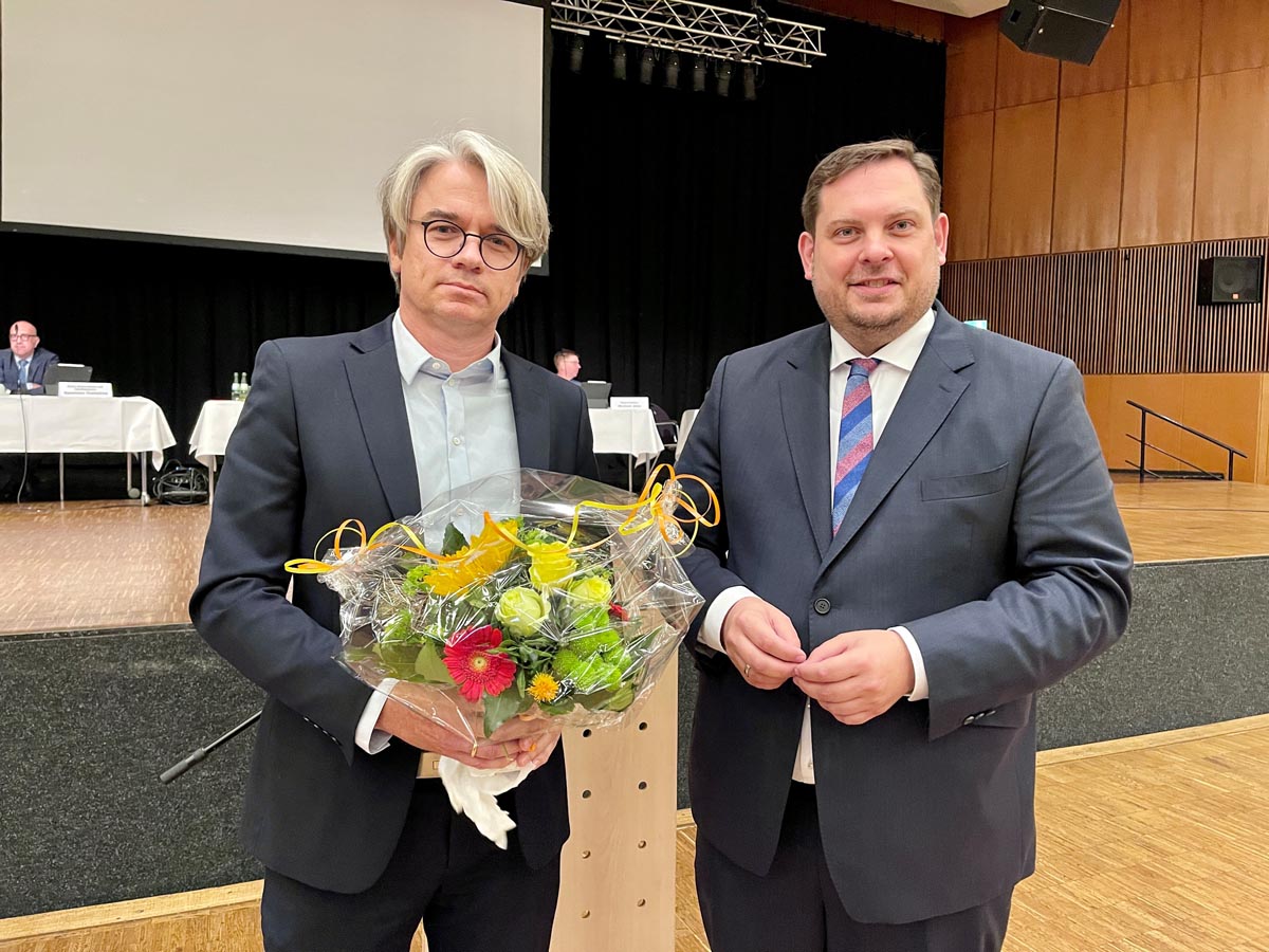 Nach der Wahl beglückwünschte ihn Oberbürgermeister Daniel Schranz und überreichte ihm einen Blumenstrauß. Thomas Palotz ist Kämmerer und Erster Beigeordneter der Stadt Dinslaken. Er tritt die Nachfolge von Sabine Lauxen an, die im Juni 2020 nicht wiedergewählt worden war.