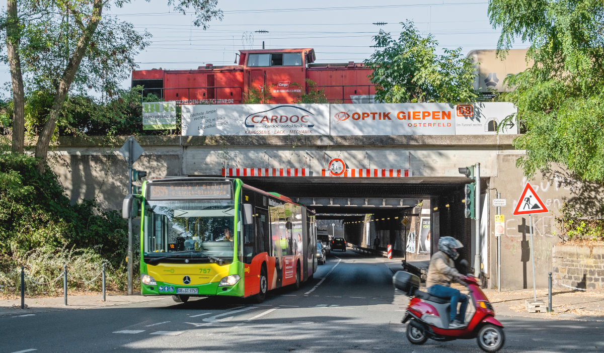 Während der Brückenarbeiten muss die Osterfelder Straße im Bereich unterhalb der Eisenbahnbrücken für den Verkehr gesperrt werden. Durch das neue Bauverfahren verkürzt sich auch der Sperrzeitraum, der mit dem Start der Brückenarbeiten im Februar 2027 beginnt.