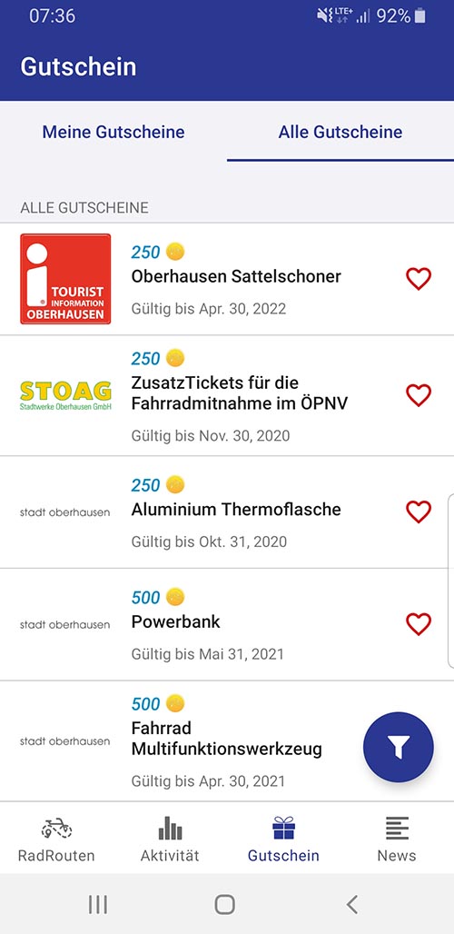 Die App bietet dem Nutzer ein Belohnungssystem. Für jeden gefahrenen Kilometer wird ein Punkt als RadMünze auf dem Nutzerkonto gutgeschrieben. Die gesammelten RadMünzen können dann bei teilnehmenden Partnern in Form eines Gutscheins eingelöst werden.