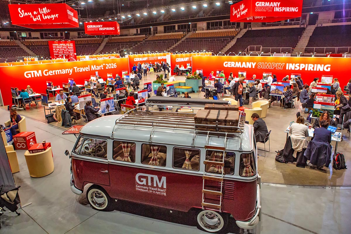 24.04.2026 - Beim 52. Germany Travel Mart (GTM) der Deutschen Zentrale für Tourismus (DZT) sind in Oberhausen über 200 Reiseveranstalter aus aller Welt auf 160 deutsche Destinationen und Anbieter von Unternehmen aus der Tourismuswirtschaft getroffen. Lufthansa und Sixt als DZT-Premiumpartner, Expedia, Kuoni oder GetYourGuide sind nur einige der renommierten Vertreter aus der Tourismusbranche, die anlässlich des GTM nach Oberhausen gereist waren. An den Gesprächscountern der Ausstellungsfläche in der Rudolf Weber-Arena in Oberhausens Neuer Mitte sind in dem Zeitraum über 4.500 Gesprächstermine mit dem internationalen Fachpublikum vermittelt worden. Hauptsächliches Ziel der Gespräche waren das Knüpfen neuer Geschäftskontakte, der Austausch über Branchentrends und Vertragsverhandlungen für das kommende Jahr. Der GTM gilt als das größte touristische Incoming-Event Deutschlands und wird von der DZT jedes Jahr in einer anderen Stadt ausgerichtet.